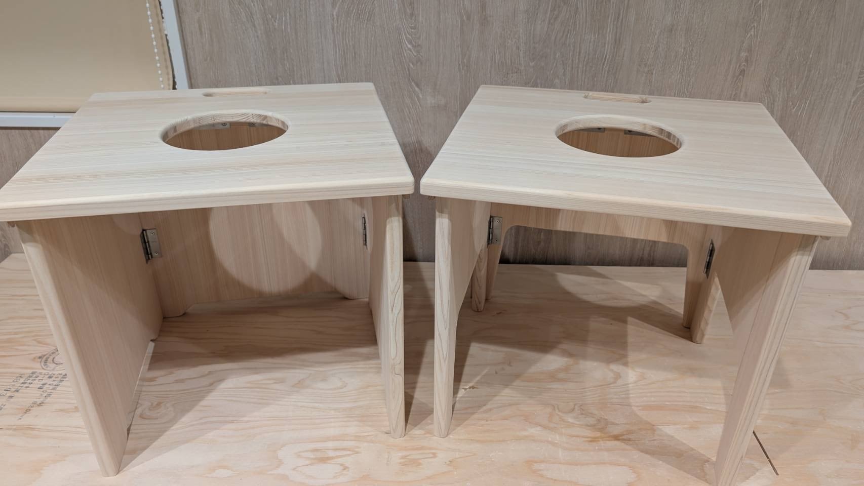 折り畳みタイプ、標準タイプの左右背面の足回りのくり抜きを下まで下げます。(写真左)